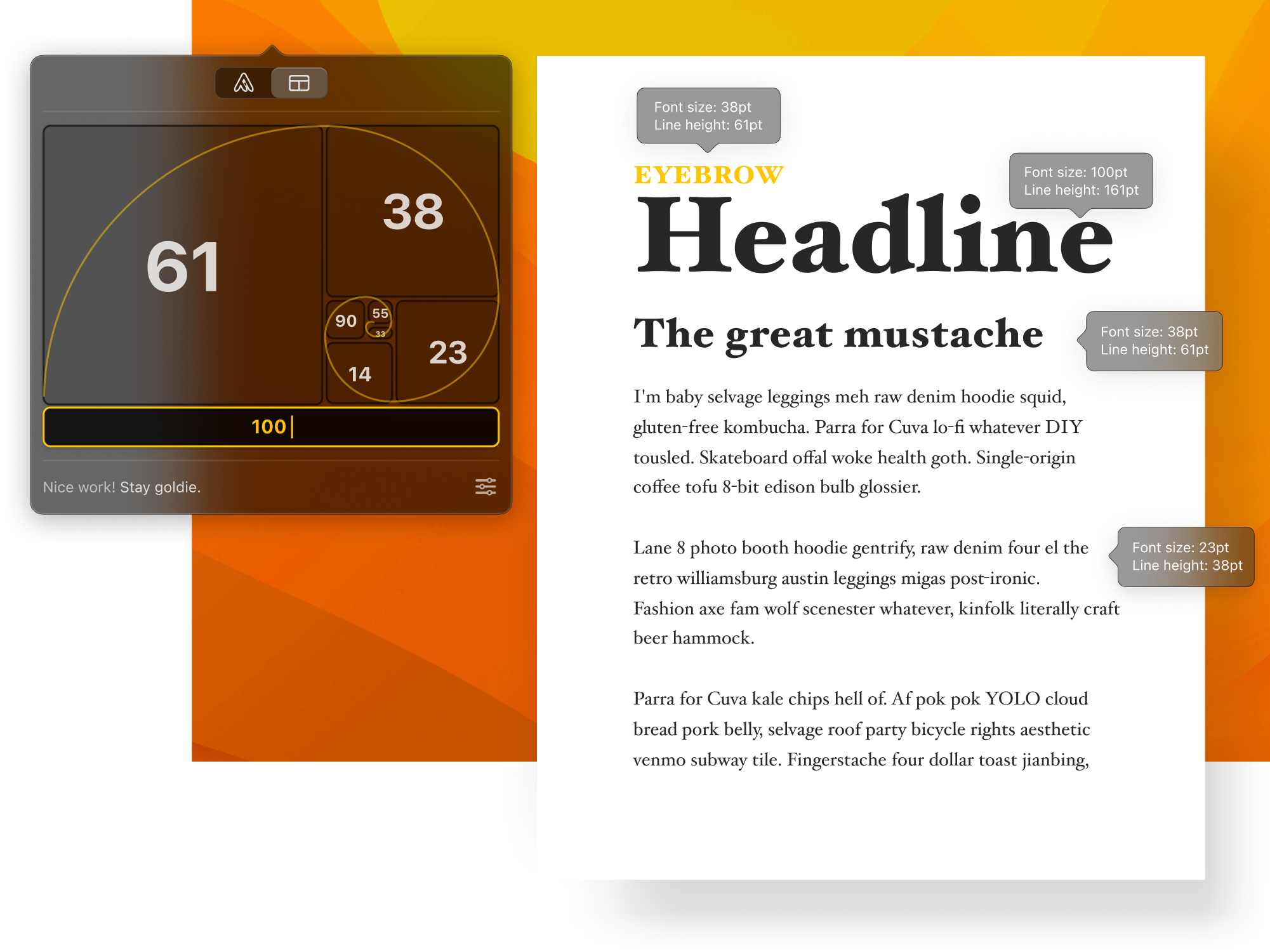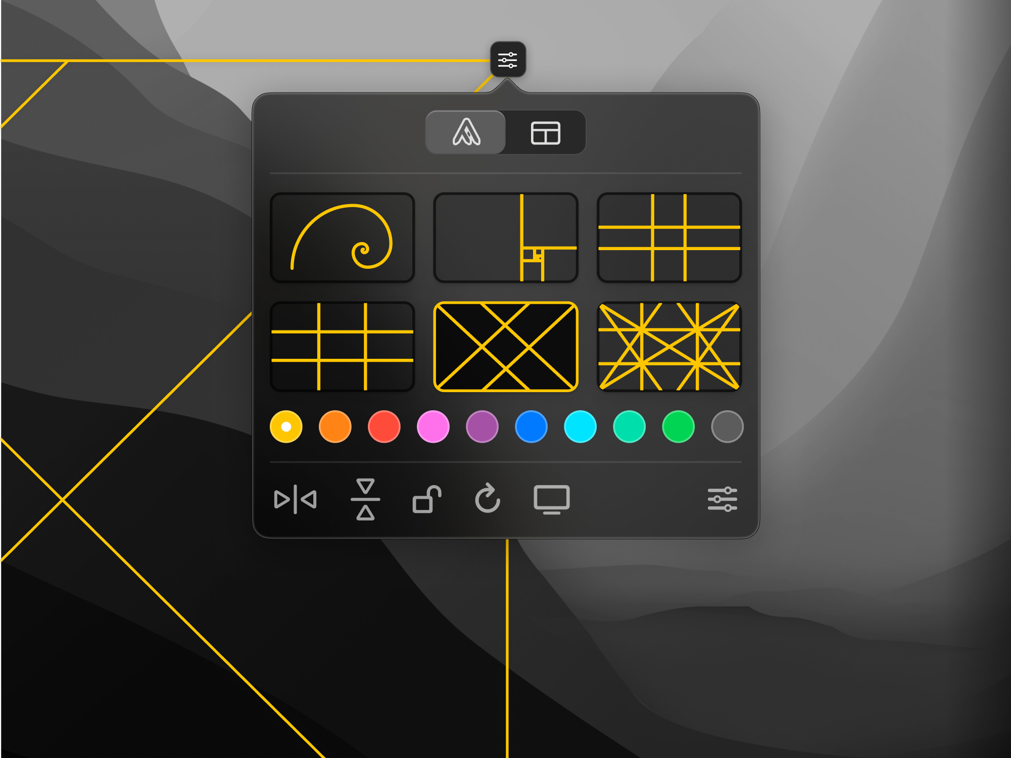 Goldie lives in the top menu bar for easy opening and overlay, or drag and drop SVG guides in any program. Light and dark mode options for whichever works best for your eyes.
