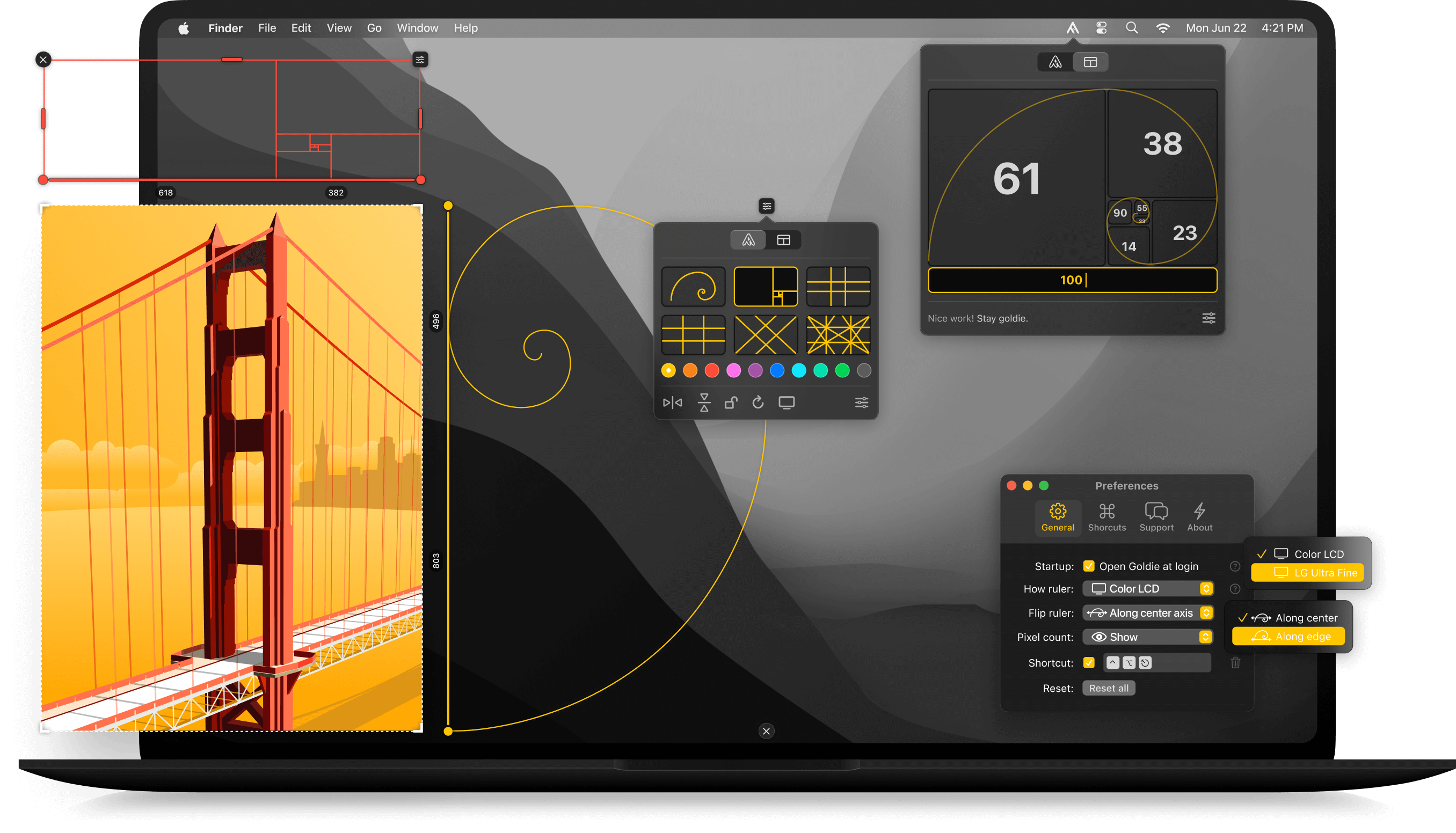 Goldie App adapts to background color while applying an overlay ruler on your screen. Ruler-referencing made simple!